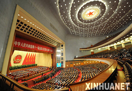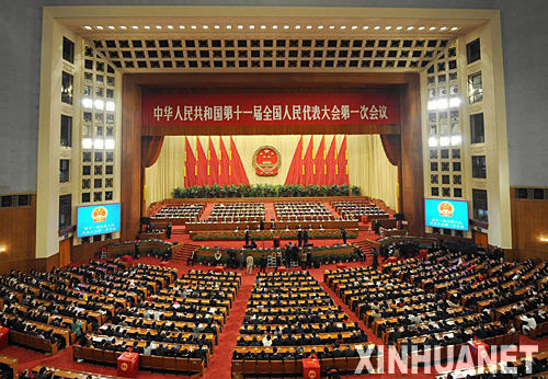 3月17日,十一届全国人大一次会议在北京人民大会堂举行第七次全体会议。决定国务院副总理、国务委员、各部部长、各委员会主任、中国人民银行行长、审计长、秘书长人选;表决全国人大各专门委员会组成人员。这是大会会场。 新华社记者王建华摄