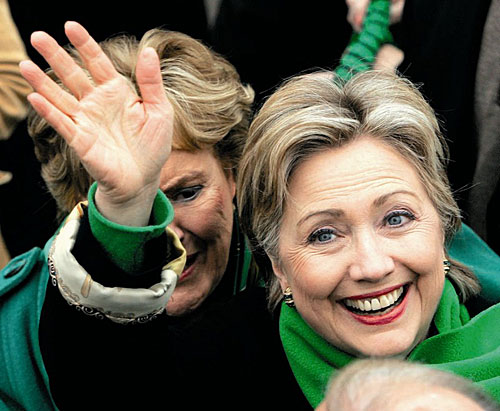 3月15日,在美国宾夕法尼亚州匹兹堡市的圣帕特里克节日大游行队伍中,围着绿色围巾的民主党总统竞选人希拉里向支持者挥手。美国宾夕法尼亚州民主党预选将在4月22日举行。每年的3月17日,是西方的圣帕特里克节。东方IC/供图