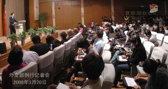 2008年3月20日下午,外交部发言人秦刚举行例行记者会,就近期拉萨发生的打砸抢烧严重暴力犯罪事件等问题答问。