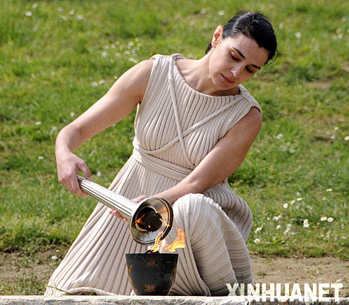 3月22日,扮演最高女祭司的玛利亚·娜芙普利都在彩排仪式上点燃火种罐。当日,希腊奥林匹亚再次举行北京奥运会圣火采集仪式彩排,并成功试采到新的火种。 新华社记者 吴晓凌摄