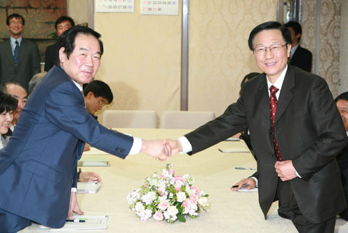 3月23日,中国财政部长谢旭人(右)和日本财务大臣额贺福志郎(左)在日本首都东京举行会谈。当天,第二次中日财长对话会议在东京举行。新华社记者 任正来 摄