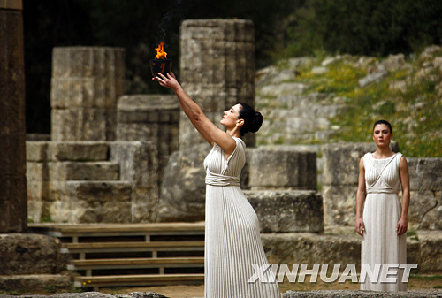 3月23日,扮演最高女祭司的玛利亚·娜芙普利都(左)在彩排仪式上高高举起火种罐。当日,北京奥运会圣火采集仪式在奥林匹亚进行最后一次彩排。新华社记者毕明明摄