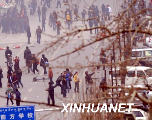 3月14日中午,在拉萨市朵森格路,不法分子在向路边商铺、汽车扔石头。这是一起骇人听闻的严重暴力犯罪事件。3月14日,一群不法分子在西藏自治区首府拉萨市区的主要路段实施打砸抢烧,焚烧过往车辆,追打过路群众,冲击商场、电信营业网点和政府机关,给当地人民群众生命财产造成重大损失,使当地的社会秩序受到了严重破坏。事后查明,这天,不法分子纵火300余处,拉萨908户商铺、7所学校、120间民房、5座医院受损,砸毁金融网点10个,至少20处建筑物被烧成废墟,84辆汽车被毁。有18名无辜群众被烧死或砍死,受伤群众达382人,其中重伤58人。拉萨市直接财产损失达24468.789万元。 这是一场反对分裂,维护祖国统一和民族团结的斗争。 为了尽快恢复正常的社会秩序,西藏自治区党委、政府组织公安、武警,对在拉萨街头十分猖狂地进行打砸抢烧的不法分子依法打击,迅速平息了事态,维护了社会稳定,维护了国家法制,维护了西藏各族群众的根本利益。根据目前掌握的情况,这起严重的暴力犯罪事件是由达赖集团有组织、有预谋、精心策划煽动的,是由境内外“藏独”分裂势力相互勾结制造的。 新华社记者 格桑达瓦 摄
