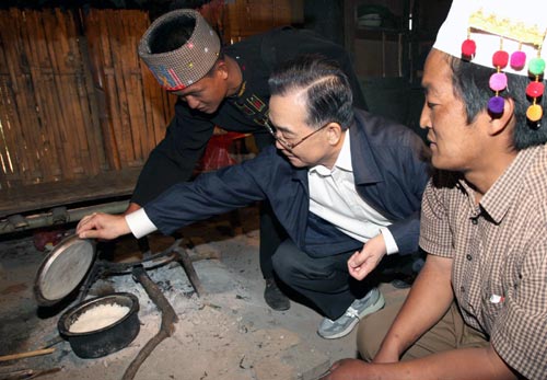 在丁孔洪的家里,温家宝详细地询问了景颇族村民的生产生活情况。他还走进简陋的厨房,蹲下身子揭开锅盖看一看伙食;来到破旧的卧室,仰头望一望屋顶是否破漏。