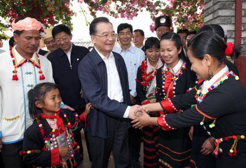 新华网昆明4月2日电(记者 赵承)3月31日至4月1日,中共中央政治局常委、国务院总理温家宝在出席大湄公河次区域经济合作第三次领导人会议后,乘飞机从万象赶赴云南省德宏傣族景颇族自治州,先后考察走访了傣族、景颇族、德昂族三个少数民族村寨,并利用晚上的时间召开了基层少数民族群众座谈会。