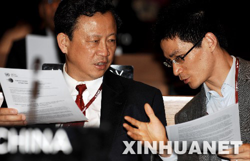 4月4日,中国气候变化谈判特别代表于庆泰大使(左)在闭幕会议上与其他代表交谈。 当日,联合国气候变化谈判在泰国曼谷闭幕。联合国气候变化谈判于3月31日在泰国首都曼谷拉开帷幕,这是去年12月联合国气候变化大会通过“巴厘岛路线图”后启动的首轮相关谈判。 新华社记者 凌朔 摄