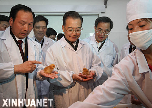 4月5日至6日,中共中央政治局常委、国务院总理温家宝在河北考察农业和春耕生产。这是4月6日,温家宝在邯郸市考察华裕家禽育种有限公司时,了解小鸡的育种生产和销售情况。 新华社记者刘卫兵摄