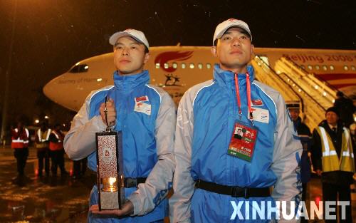 4月6日,两名圣火护卫手在“奥运圣火”号专机前展示火种灯。当日,“奥运圣火”号专机抵达法国巴黎。7日,北京奥运会圣火境外第五站的传递活动将在巴黎举行。 新华社记者宋立东摄