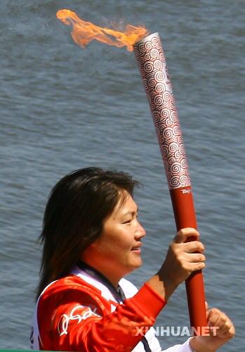 4月9日,在圣火传递起点――麦科维湾,第一棒火炬手、奥运冠军林莉手持火炬传递。当日,北京奥运会圣火传递活动在美国旧金山举行。这是北京奥运会圣火境外传递的第六站。 新华社记者侯俊摄