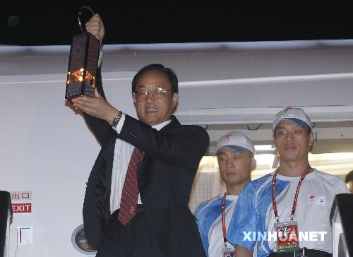 4月12日,北京奥组委执行副主席刘敬民(左)手持火种灯步出机舱。 当日,运送北京奥运圣火的专机从阿根廷首都布宜诺斯艾利斯飞抵坦桑尼亚达累斯萨拉姆。13日,北京奥运会火炬境外第八站的传递将在这座坦桑尼亚的最大城市举行。 新华社记者戚恒摄