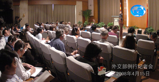 2008年4月15日下午,外交部发言人姜瑜举行例行记者会,就奥运火炬传递、中法关系、CNN电视主持人反华言论等问题答记者问。