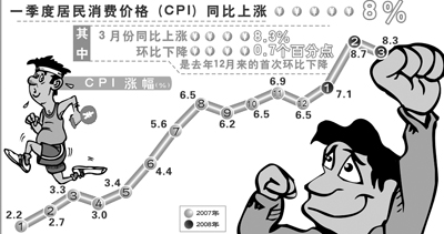 能否抑制通货膨胀,是今年中国经济面临的重大考验。一季度的情况不容乐观。从去年8月份起,居民消费价格涨幅连续5个月达到6%以上,今年以来涨幅又有所升高。一季度居民消费价格同比上涨8%,比上年同期升高5.3个百分点,比上年全年升高3.2个百分点。与此同时,工业品出厂价格,以及原材料、燃料、动力购进价格也在加快上涨,再考虑到国际初级产品持续大幅上涨的外部环境,今年要实现政府工作报告提出的4.8%左右的物价调控目标,面临着较大压力。