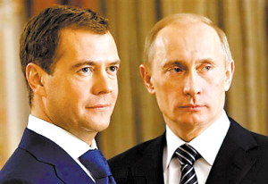 俄当选的总统梅德韦杰夫(左)与现任总统普京在一起。(资料图片)