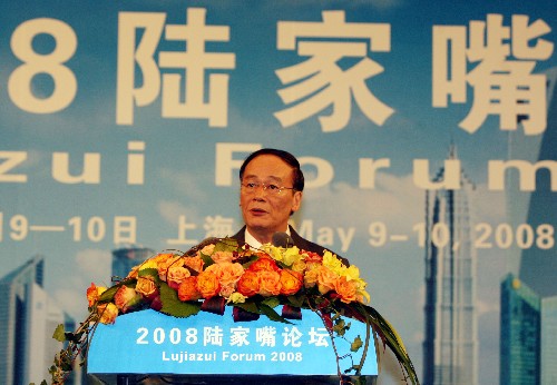 5月9日,中共中央政治局委员、国务院副总理王岐山出席论坛开幕式并演讲。 当日,“2008陆家嘴论坛”在上海开幕。出席本次论坛的中外金融界重要人士共有100多名。中国人民银行行长周小川和上海市市长韩正担任本次论坛联合主席,论坛主题是“世界格局中的中国金融”。 新华社记者 张明 摄
