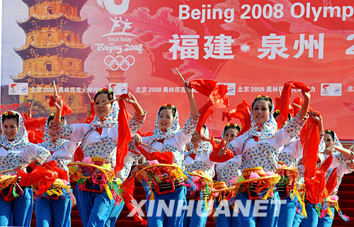 今天的泉州天气晴好,碧空万里,尽管并非节假日,但奥运圣火的到来还是给这个城市平添了几分节日的色彩。泉州站传递的起跑仪式设在中国闽台缘博物馆正门前大广场。在今天上午的火炬起跑仪式上,泉州市在这里安排了一些具有泉州民俗特色的舞台表演,观众欣赏到了传统的群鼓狮舞《鼓震名城》、大型歌舞《刺桐礼赞》、激情劲舞《青春梦飞扬》等,这也成为了今天传递的第一个看点。