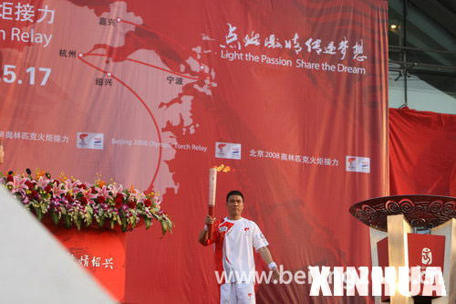 5月17日,最后一棒火炬手马建明代表所有绍兴传递的火炬手,将他们的捐款交给绍兴市民政局。当日,北京奥运会圣火在浙江绍兴传递。 新华社记者王小川摄