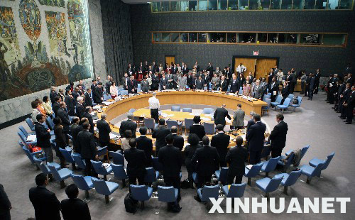 5月20日,在美国纽约联合国总部举行的联合国安理会会议上,联合国秘书长潘基文(中)与安理会成员集体默哀,对中国四川汶川大地震遇难者表示哀悼。 新华社记者侯俊摄