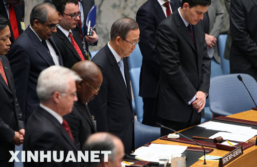 5月20日,在美国纽约联合国总部举行的联合国安理会会议上,联合国秘书长潘基文与安理会成员集体默哀,对中国四川汶川大地震遇难者表示哀悼。 新华社记者侯俊摄