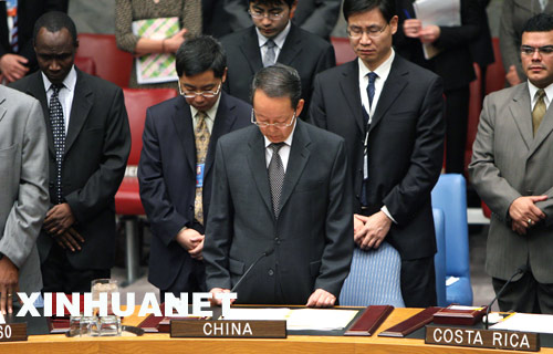 5月20日,在美国纽约联合国总部举行的联合国安理会会议上,中国常驻联合国代表王光亚(前中)与安理会成员集体默哀,对中国四川汶川大地震遇难者表示哀悼。 新华社记者侯俊摄