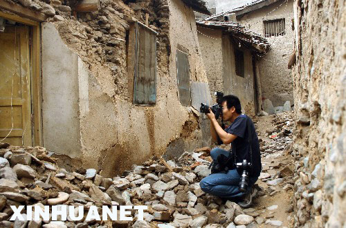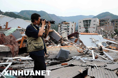 2008年5月18日,新华社摄影记者李涛在地震重灾区――北川县采访。 新华社发