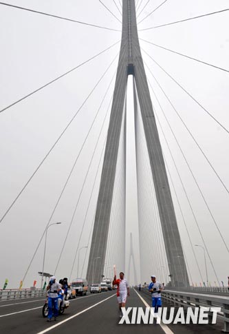 新华网江苏南通5月25日电(记者王恒志、郭奔胜)奥运圣火25日下午在江苏省南通市进行传递,圣火在新落成的苏通大桥上完成交接,成为南通市圣火传递的一大亮点。