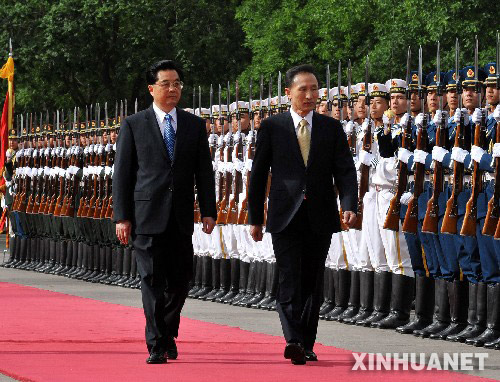 会谈前,胡锦涛主席在人民大会堂东门外广场为李明博总统访华举行欢迎仪式。胡锦涛主席夫人刘永清、全国人大常委会副委员长陈昌智、国务委员戴秉国、全国政协副主席黄孟复、民进中央副主席王佐书、外交部部长杨洁篪、教育部部长周济、科技部部长万钢、商务部部长陈德铭、中国驻韩国大使宁赋魁等出席欢迎仪式。