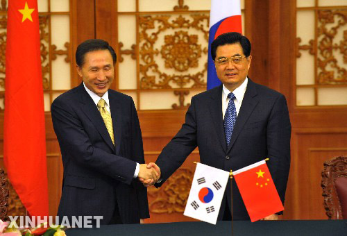 李明博表示,对华关系是韩国外交轴心之一。韩方高度重视进一步深化两国关系,此次双方同意将韩中全面合作伙伴关系提升为战略合作伙伴关系,将为两国关系发展开辟广阔前景。韩方希望保持两国高层互访,加强各层次磋商,密切双方在国际和地区问题上的协调合作,扩大人员交往,特别是青少年交流,积极深化和拓展双方在投资、金融、通信、能源、环保、科技、新能源开发利用等领域的互利合作,欢迎中国企业赴韩投资,支持韩方企业来华发展,促进双方中小企业间的合作。李明博强调,韩方愿成为中国真正的伙伴,与中方共同努力,推进两国关系向更深、更广、内涵日趋丰富的方向发展,并为促进东北亚地区的和平稳定作出积极贡献。