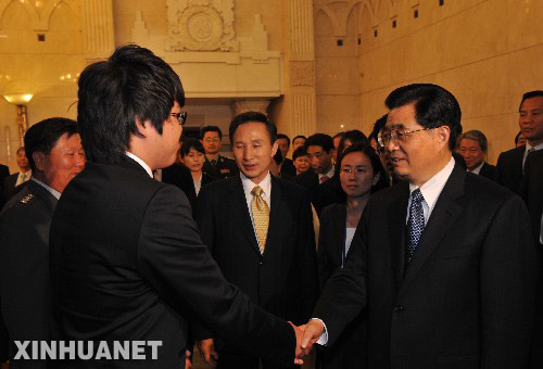 当晚,胡锦涛与李明博还共同会见了韩国赴四川地震灾区救援队队长金永锡及韩国在华留学生北京奥运会韩国志愿者代表金珍镐。胡锦涛感谢韩方在中国四川汶川大地震发生后向中方表示深切同情并提供宝贵支援,以及对北京奥运会给予的大力支持。胡锦涛说,在中国人民遭受地震灾害时,韩方及时派遣救援队赶赴灾区,与中国人民一起投身到抗震救灾中,韩方救援队不辞辛劳、不畏艰险,表现十分出色。我代表中国人民特别是灾区人民向你们表示感谢。