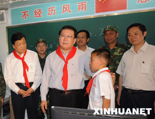 李长春十分惦念灾区少年儿童学习和生活情况。他来到八一帐篷学校,看望正在这里上课的小学生。在一间宽敞的教室里,孩子们正在上计算机课。李长春走进教室,少先队员给他戴上了红领巾。当听说12岁的北川县禹里小学六年级学生熊弼呈在地震中奋不顾身救出两个同学时,李长春称赞熊弼呈是了不起的小英雄。他动情地说,在这场大灾难中,灾区少年儿童经受了巨大的伤痛,也表现出了超常的勇气和力量,有的不顾自身安危抢救同学,有的在危难之中坚持学习,有的在困难面前保持乐观,从你们身上,我们更加深切地感受到了这一代少年儿童的优良品质,看到祖国未来大有希望。