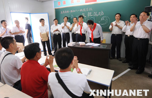 这是李长春在绵阳八一帐篷学校看望在地震中不顾个人安危抢救学生的教师们,向他们表示真诚感谢。 新华社记者李学仁摄