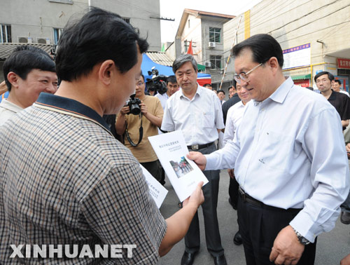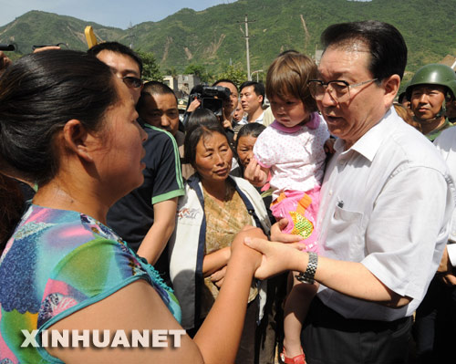 这是6月2日,李长春在平武县南坝镇察看灾情,慰问灾区干部群众和救援人员,指导抗震救灾工作。 新华社记者 李学仁 摄