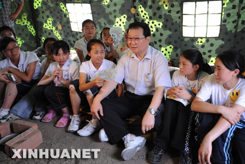 这是6月2日,李长春专程赶到设在长虹培训中心的北川中学临时学校,走进教室,看望在这里复课的学生。 新华社记者 李学仁 摄