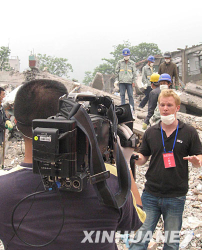 5月17日,一名外国记者(前右)在北川中学废墟上进行现场报道。 新华社记者 徐壮志 摄
