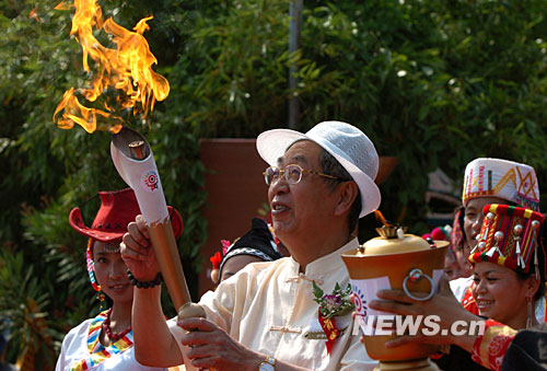 6月11日,全国人大常委会原副委员长许嘉璐点燃“中华56民族之歌”音乐火炬。