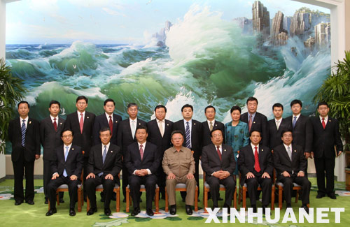 6月18日,朝鲜劳动党总书记、国防委员会委员长金正日在朝鲜平壤百花园国宾馆会见中共中央政治局常委、国家副主席习近平。这是会见前合影。 新华社记者 兰红光 摄