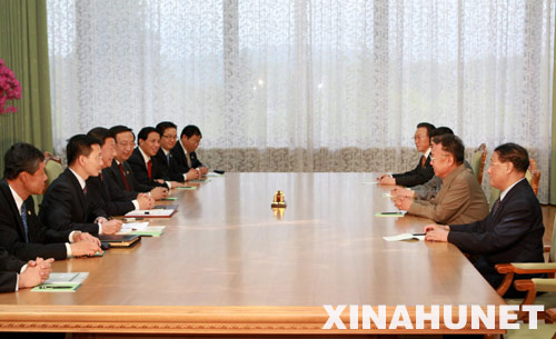 6月18日,朝鲜劳动党总书记、国防委员会委员长金正日在朝鲜平壤百花园国宾馆会见中共中央政治局常委、国家副主席习近平。 新华社记者 庞兴雷 摄