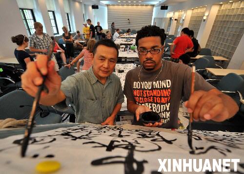 6月24日,北京奥运会媒体运行海外志愿者柯凯文(右)向老师高原请教中国书法。当日,来自美国爱荷华大学的24名北京奥运会媒体运行海外志愿者在清华大学新闻与传播学院体验中国书法。这些志愿者是22日到达北京的,他们将在清华大学参加为期一周的中国文化培训,之后与其他292名媒体运行海外志愿者参加北京奥组委组织的场馆及岗位培训。 新华社记者罗晓光摄