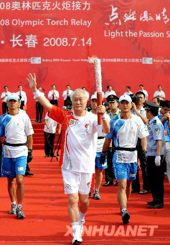 7月14日,第一棒火炬手、中科院院士王家骐开始传递。当日,北京奥运圣火在吉林省长春市传递。 新华社记者王昊飞摄