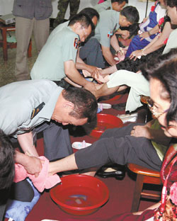 台陆军六军团在军中推动孝道,希望官兵透过为母亲洗脚体验母亲的辛劳。图为六军团官兵为当选模范母亲跪地洗脚的场景,其中六军团政战主任曾有福少将(左)穿军服下跪为母洗脚。