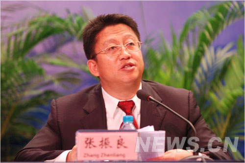 7月14日上午,BIMC举行北京奥运观赛规则和“文明观赛、微笑承诺”活动启动仪式。图为北京奥组委志愿者部副部长张振良。(新华网 文涛摄)