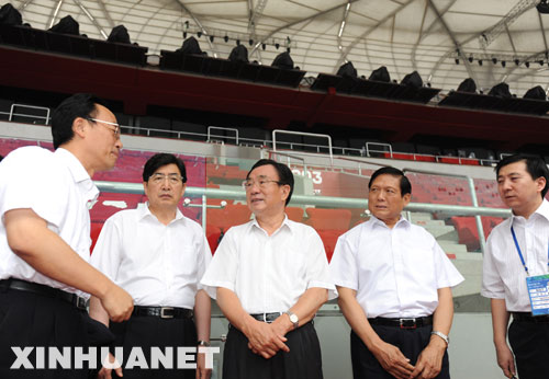 7月14日,中共中央政治局常委、中央纪委书记贺国强考察北京奥运会场馆建设和奥运村。这是贺国强在国家体育场听取情况介绍。 新华社记者黄敬文摄