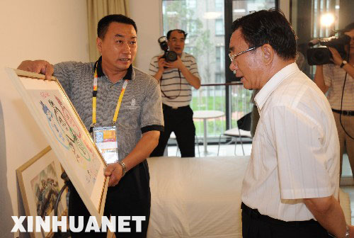 7月14日,中共中央政治局常委、中央纪委书记贺国强考察北京奥运会场馆建设和奥运村。这是贺国强在奥运村考察运动员公寓时观看房间内的奥运题材儿童画。 新华社记者黄敬文摄