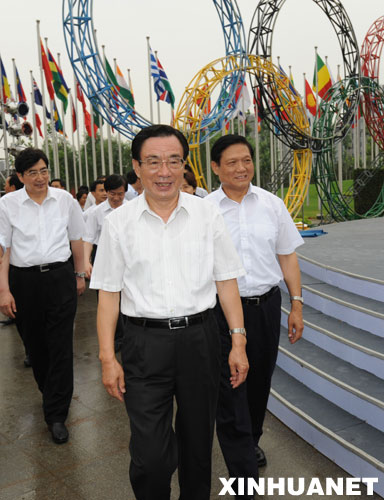 7月14日,中共中央政治局常委、中央纪委书记贺国强考察北京奥运会场馆建设和奥运村。这是贺国强在奥运村考察升旗广场。 新华社记者黄敬文摄