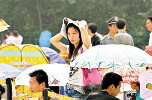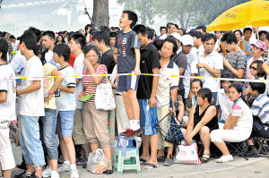 排在第一位的是一个名叫徐永恒的东北小伙。记者昨日下午见到他时,他和同伴已经足足等待了30多个小时。记者看到,在徐永恒身边,除了一张稍显破旧的凉席外,身边是五六个空矿泉水瓶。与身边打着伞戴着墨镜来来往往的帅哥美女不同,25岁的徐永恒一脸黝黑,“我们本来很白的,都是这两天给晒的”。