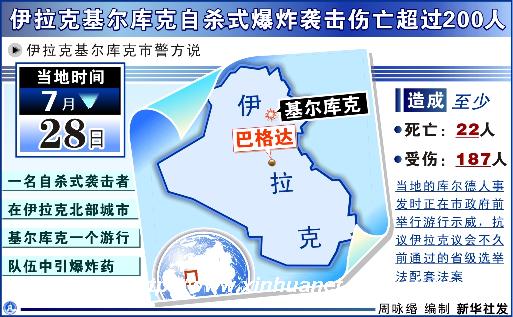 新华网巴格达7月28日电(记者惠晓霜 亢德喜)伊拉克基尔库克市警方28日说,当天发生在基尔库克市的自杀式爆炸袭击已经造成22人死亡、187人受伤。