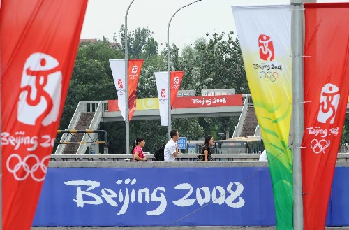 7月29日,行人从北京街头一处立交桥上经过。当日是北京奥运会倒计时10天,北京主要街道到处都式奥运彩旗和宣传画,洋溢着浓郁的奥运气氛。新华社记者 武巍 摄