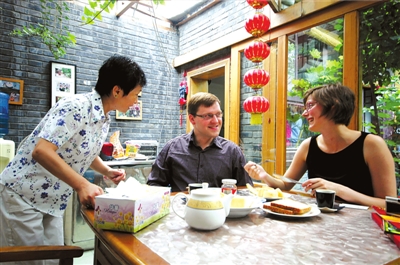 “Do you wantsometea?”王志熹一边和记者聊天,一边不忘为西蒙娜服务。为接待外国游客,她和丈夫荆继昌专门请了老师学习英语,现在已基本能用英语和外国人交流了。