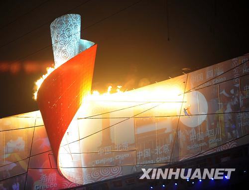 8月8日,第29届夏季奥林匹克运动会在中国国家体育场隆重开幕。这是主火炬塔被点燃。新华社记者刘大伟摄