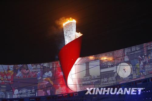 8月8日,第29届夏季奥林匹克运动会在国家体育场隆重开幕。这是李宁点燃主火炬。新华社记者凡军摄