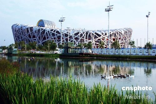 7月28日,2008北京国际新闻中心举行“科技奥运”新闻发布会,北京市环保局副局长、新闻发言人杜少中表示,国际奥委会及相关的医学委员会,曾对北京空气质量作出评价,认为北京在奥运会期间的空气质量不影响运动员的健康。图为近日拍摄的国家体育场“鸟巢”。 中新社发 王东明 摄